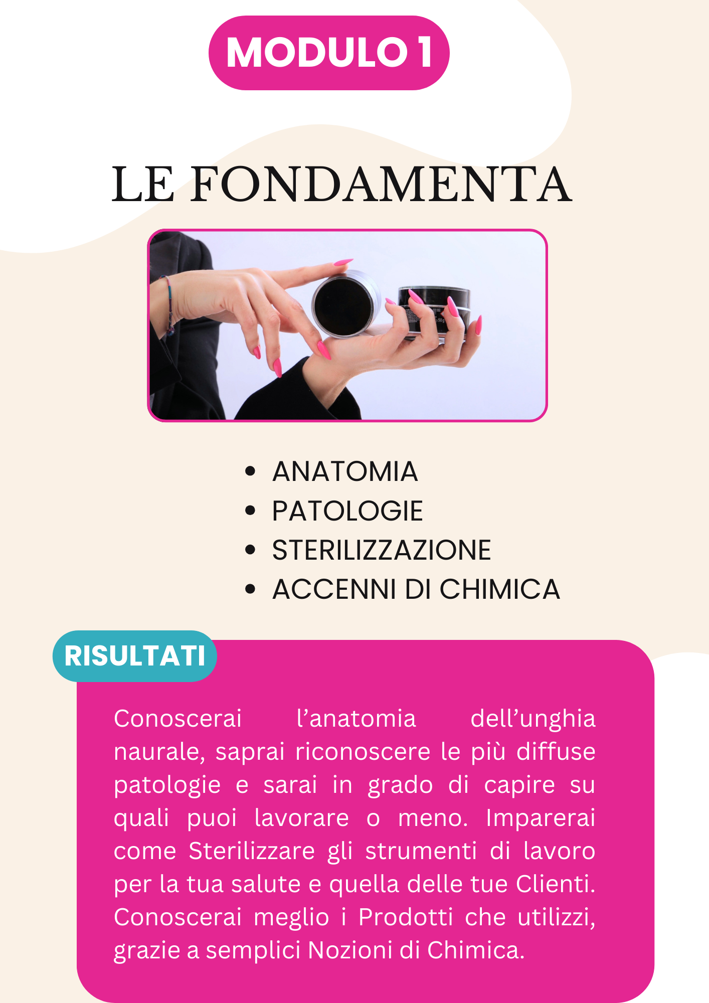 Ogni modulo è stato creato ascoltando i bisogni reali delle onicotecniche e perfezionato per garantire risultati concreti.